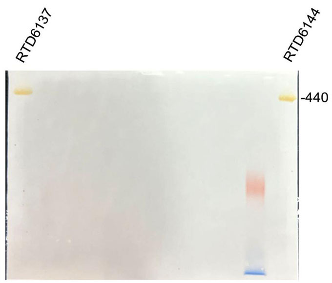 3. 非變性蛋白電泳Marker(RTD6137,RTD6142,RTD6144)由于要保持蛋白的天然結構,都沒有偶聯(lián)染料,在電泳時基本都看不到條帶;然而,RTD6137和RTD6144中的440 kD和880 kD由于天然蛋白中含有鐵離子,使得電泳后在膠上可見淡黃色,其中440 kD顏色更深。凝膠轉膜后,膜上也可以看到黃色的440 kD條帶(下圖),可以大體判斷Marker轉膜的效果。