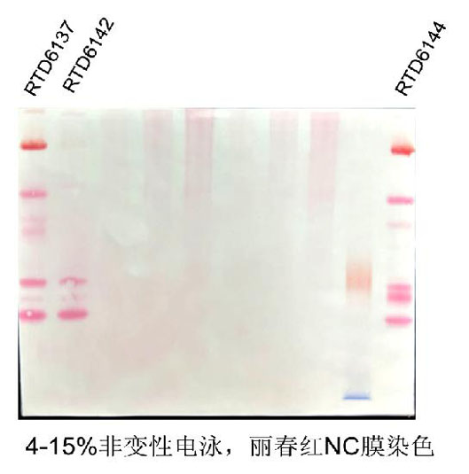 第一種方法:凝膠轉膜后用麗春紅染色液(貨號:RTD6301)染膜,可以看到Marker條帶,順便可以檢測轉膜效率,然而要注意的是麗春紅染色靈敏度比較低,可能不能完全看到完整的Marker條帶。