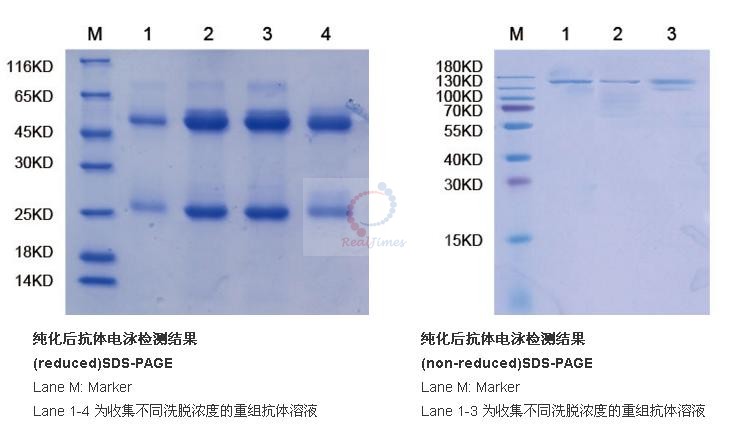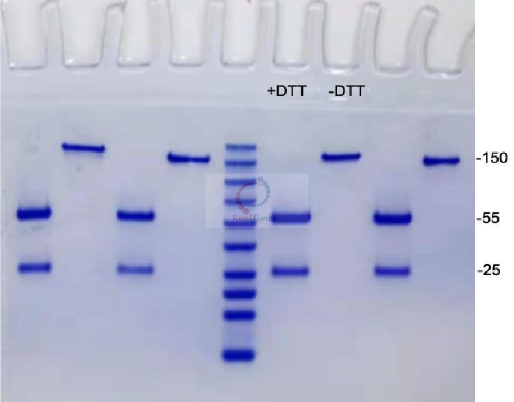 如需測定目標(biāo)蛋白的純度及分子量(為多聚體分子量),則一般采用非還原SDS-PAGE:采用該電泳方法,二聚體、多聚體在凝膠中的位置會(huì)處于單體分子量2倍或多倍的位置,利于觀察及各組分的定性定量分析。當(dāng)然這種蛋白的聚體形成是依靠二硫鍵來維持的。