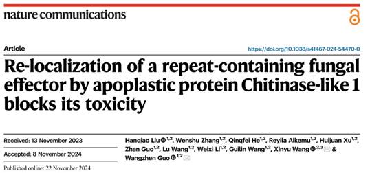 《Nature Communications》發表棉花遺傳育種團隊“Re-localization of a repeat-containing fungal effector by apoplastic protein Chitinase-like 1 blocks its toxicity”