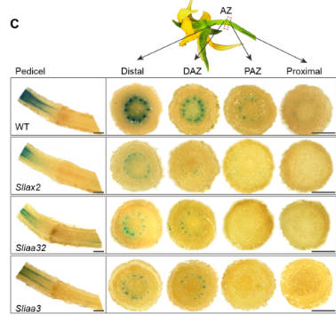 鑒于 SlGATA6 調控生長素運輸載體 SlLAX2的表達,該研究通過生長素特異性抗體的免疫熒光雜交技術及離區組織切片分析,在細胞層面揭示了生長素的空間分布模式,首次實現了生長素梯度的空間維度解析,證實了 SlGATA6 是維持這一梯度的關鍵。通過免疫熒光雙標試驗發現,SlIAA3 與 SlIAA32 蛋白信號強度在遠軸端到近軸端方向呈現相反的分布規律,即遠軸端 SlIAA32 信號強,SlIAA3 信號弱,近軸端則反之。值得注意的是,SlIAA32 和 SlIAA3 的總信號強度由遠軸端到近軸端顯著減弱,形成了離區生長素的信號梯度。由于 SlIAA32 和 SlIAA3 均可以提高生長素信號,且破壞 SlIAA32 和 SlIAA3 的功能都能夠導致生長素信號嚴重受損,表明 SlIAA32 和 SlIAA3 是建立生長素響應梯度的關鍵因子。