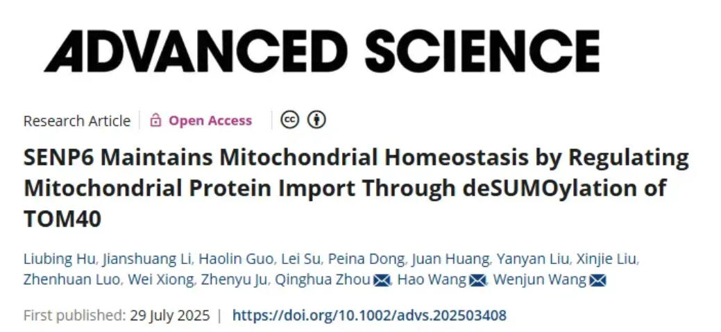 2025年7月29日,暨南大學王文君,暨南大學附屬第一醫(yī)院王昊、周慶華共同通訊在Advanced Science 在線發(fā)表題為“SENP6 Maintains Mitochondrial Homeostasis by Regulating Mitochondrial Protein Import Through deSUMOylation of TOM40”的研究論文。該研究闡明了SENP6敲低誘導的SUMO化會導致線粒體蛋白質(zhì)穩(wěn)態(tài)喪失,從而損害線粒體的形態(tài)和功能。