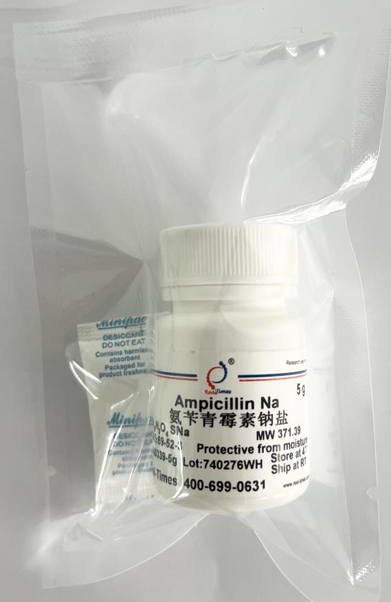 說明:A β-lactam antibiotic with an amino group side chain attached to the penicillin structure. Penicillin derivative that inhibits bacterial cell-wall synthesis (peptidoglycan cross-linking) by inactivating transpeptidases on the inner surface of the bacterial cell membrane. Mode of resistance: Cleavage of β-lactam ring of ampicillin by β-lactamase. Antimicrobial spectrum: Gram-negative and Gram-positive bacteria. Stock solution: 100mg/ml. Recommended for use in molecular biology applications at 20-50 μg/ml.