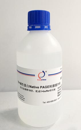 10×堿性蛋白Native PAGE轉(zhuǎn)膜緩沖液適用于堿性蛋白電泳后凝膠上非變性堿性蛋白的轉(zhuǎn)膜。本轉(zhuǎn)膜液配制便捷,稀釋后無需調(diào)節(jié)pH值。緩沖液中不含任何變性劑,保證了轉(zhuǎn)膜中維持蛋白的活性狀態(tài)。該緩沖液稀釋10倍可配成5升即用型1×緩沖液。