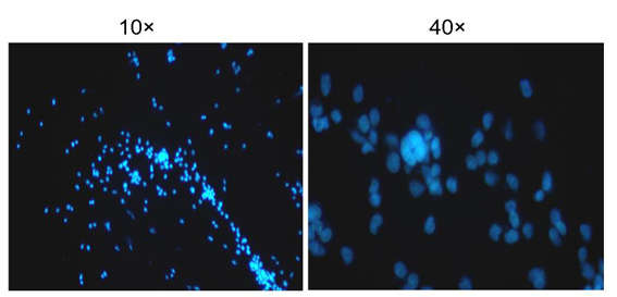 2.2 在適宜于細胞培養的溫度下培養20-30分鐘。棄染色液,用PBS洗滌2-3次即可進行熒光檢測。細胞發生凋亡時,在熒光顯微鏡下觀察會看到凋亡細胞的細胞核呈致密濃染,或呈碎塊狀致密濃染。