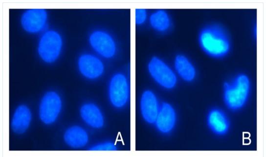HeLa細胞染色圖。圖A為正常細胞Hoehst