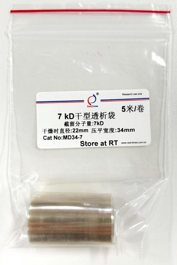 透析袋是用半透膜制成袋狀,將生物大分子樣品溶液置入袋內(nèi),將此透析袋浸入水或緩沖液中,樣品溶液中的大分子量的生物大分子被截留在袋內(nèi),而鹽和小分子物質(zhì)不斷擴(kuò)散透析到袋外,直到袋內(nèi)外兩邊的濃度達(dá)到平衡為止。保留在透析袋內(nèi)未透析出的樣品溶液稱為“保留液”,袋(膜)外的溶液稱為“滲出液”或“透析液”。新透析袋可用沸水煮五至十分鐘,再用蒸餾水洗凈,即可使用。