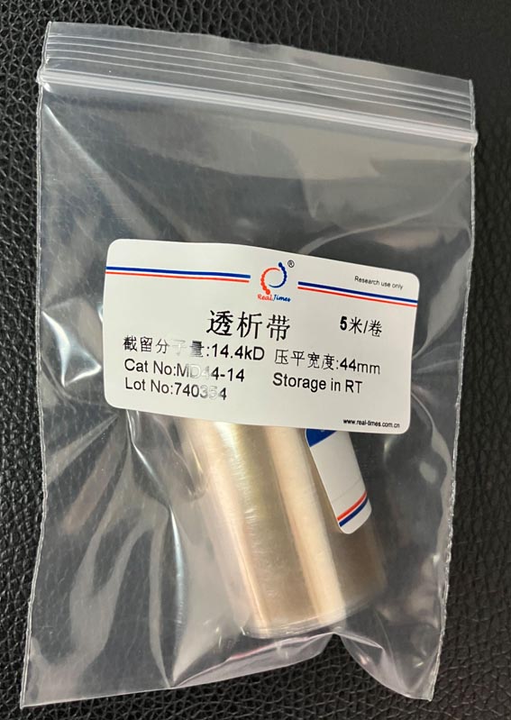 透析膜可用動物膜和玻璃紙等,但用的最多的還是用纖維素制成的透析膜,目前常用的是美國Union Carbide (聯合碳化物公司)和美國光譜醫學公司生產的各種尺寸的透析管,截留分子量MWCO(即留在透析袋內的生物大分子的最小分子量)。截留分子量越大也就是說透過性越大。