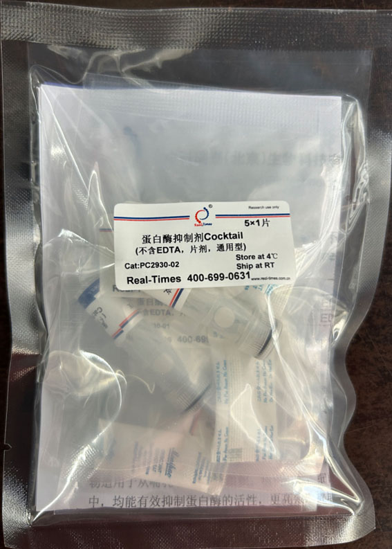 細胞裂解后的蛋白提取物中含有大量的內源性蛋白酶,這些酶可以降解細胞提取物中的蛋白,因此為了防止蛋白純化過程中目的蛋白不受蛋白酶的破壞,需要加入蛋白酶抑制劑對其進行活性抑制。本蛋白酶抑制劑Cocktail包含5種獨立的廣譜蛋白酶抑制劑,每一種抑制劑可特異性抑制某一種或幾種蛋白酶活性。該混合物的優化組合使其可以抑制幾乎所有蛋白酶活性,包括絲氨酸蛋白酶、半胱氨酸酸蛋白酶、天冬氨酸蛋白酶、丙氨酰-氨基肽酶等。此抑制劑混合物適用于從哺乳動物細胞/組織,植物組織,細菌,酵母,真菌中提取蛋白,加入到蛋白裂解液中,均能有效抑制蛋白酶的活性,更高效地提取目的蛋白。廣泛適用于Western Blot和免疫共沉淀等。本品不含有EDTA,不影響金屬依賴蛋白的活性,與金屬螯和層析兼容。