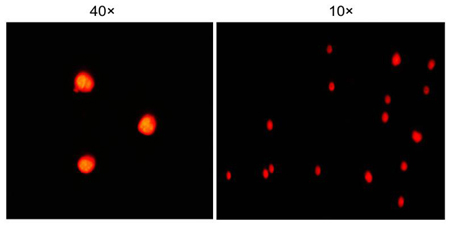 2.7熒光顯微鏡下觀察可檢測(cè)到呈紅色的細(xì)胞核。激發(fā)波長(zhǎng)為535 nm,發(fā)射波長(zhǎng)為615