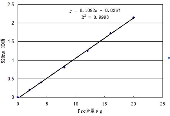 以系列脯氨酸標準(1-8號管)含量(μg)為橫坐標,以對應的吸光度為縱坐標,制作標準曲線,根據測定管的吸光度進而計算其脯氨酸含量。