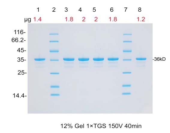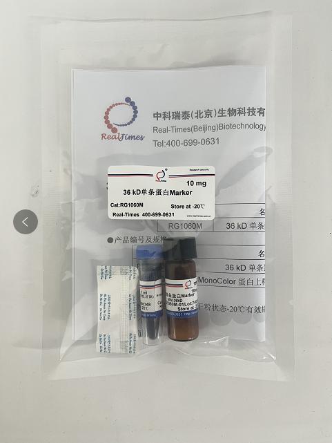 本產品包含一種已知分子量的標準蛋白質,分子量大小為36 kD,可以用來判斷 SDS-PAGE未知蛋白的分子量。36 kD單條蛋白Marker 以干粉狀態提供。配制好的Marker適用于變性還原電泳,不適用于非變性電泳(Native Electrophorosis)。