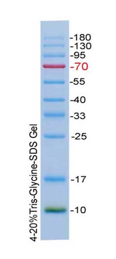 本產品包含10種純化的預染蛋白質組成,分子量范圍為10-180kD,其中70kD條帶為紅色,10kD條帶為綠色,其余條帶為藍色,可以用于SDS-PAGE和Western Blot轉膜時確定未知蛋白的分子量。
