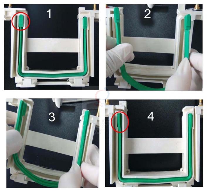 2.將密封條旋轉(zhuǎn) 180 度,正面朝里,反面朝外(圖示3),重新裝回電泳槽中并將四周壓實(圖示4),防止漏液。