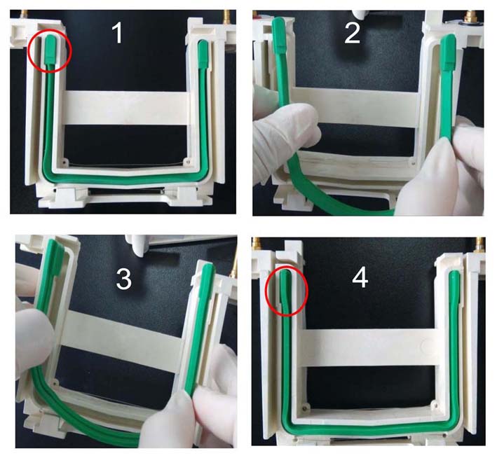 注:伯樂(lè)Mini III或Mini-PROTEAN Tetra Cell,天能VE-180,六一24K系列電泳槽請(qǐng)確保密封條的安裝方向(下圖)。