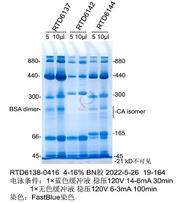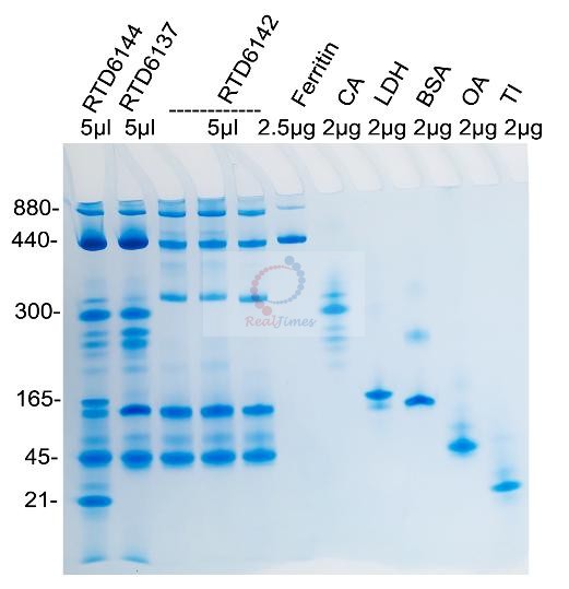 2. 該產品不含蛋白凝膠制備試劑,您可以選擇非變性PAGE凝膠制備及電泳試劑盒(貨號:RTD6130)或者蛋白預制膠(貨號RTD6118)。如自備試劑,經典Laemmli系統中把制膠溶液、電泳緩沖液和上樣緩沖液中的SDS和還原劑(DTT或β-巰基乙醇)全部去除即可進行非變性電泳。