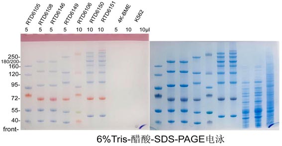 該試劑盒包含凝膠制備、蛋白上樣、蛋白電泳、蛋白染色及轉膜所需的全部試劑。試劑盒配套的制膠溶液,可以配制10板厚度1mm凝膠(面積8×10 cm),分離膠濃度為6%,可以有效分離50-500 kD范圍內蛋白。配好的凝膠濃縮膠為紅色,方便上樣。本試劑盒用于蛋白變性還原電泳,不適用于蛋白非變性電泳。
