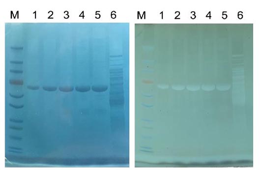本試劑采用以銅離子為基礎(chǔ)的負(fù)染色方法,用于SDS-PAGE或Native-PAGE電泳凝膠染色,不需要使用含有刺激性的甲醛和冰醋酸,實驗方便快速,可以在30 min左右完成,最低能夠檢測出2 ng的蛋白條帶,該方法不對蛋白質(zhì)產(chǎn)生修飾作用,而且經(jīng)過脫色液處理后,可以用于電洗脫或采用PAGE膠蛋白微量回收試劑盒(貨號:RTD8108)進行膠回收,以便進行質(zhì)譜和測序分析等,也可以用其他染色方法(銀染或考染)對膠重新染色。