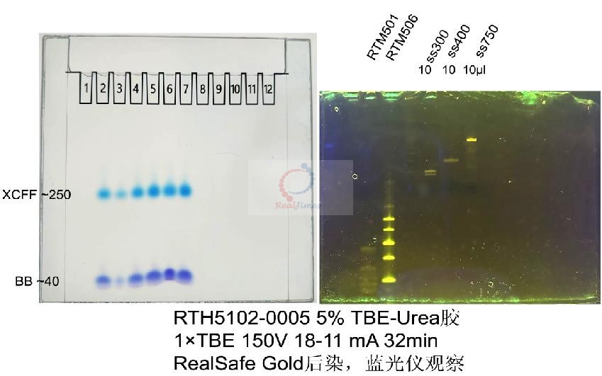 單鏈DNA或RNA樣品可以用單鏈DNA PAGE電泳染色試劑盒(貨號:RTS5103),核酸PAGE電泳染色試劑盒(貨號:RTS5102)或核酸快速高靈敏度染色試劑盒(貨號:RTS5101)染色均可以得到清晰的條帶分離效果。注:如果使用核酸染料染色,RealSafe Red(貨號:GR002)或RealSafe All(貨號:GR004)核酸染料結(jié)合單鏈核酸效果最佳,強(qiáng)烈建議使用以便獲得最佳效果的膠圖。其余染料如GelRed,Goldview,EB等染色效果不好。