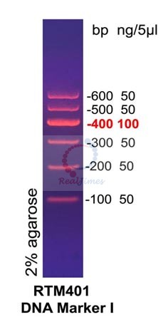 本產品是由6條帶狀雙鏈DNA條帶組成,適用于瓊脂糖凝膠電泳中DNA條帶的分析。產品中已含有1×loading buffer,可根據實驗需要,直接取2-5μl電泳,使用方便,電泳圖像清晰。6條帶的大小和含量分別為100(50 ng/5 μl),200(50 ng/μl),300(50 ng/μl),400100 ng/μl,500(50 ng/μl),600(50 ng/μl) bp。其中400bp條帶加亮顯示。