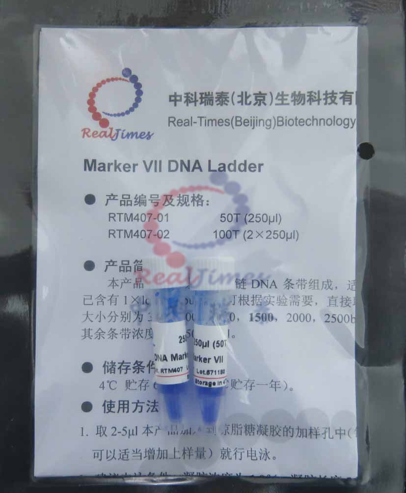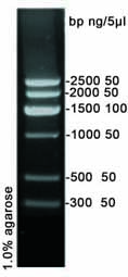 本產品是由6條帶狀雙鏈DNA條帶組成,適用于瓊脂糖凝膠電泳中DNA條帶的分析。產品中已含有1×loading buffer,可根據實驗需要,直接取2-5μl電泳,使用方便,電泳圖像清晰。6條帶的大小分別為3005001000150020002500bp。其中1500bp條帶約為100ng/5μl,顯示加亮帶,其余條帶濃度大約50ng/5μl