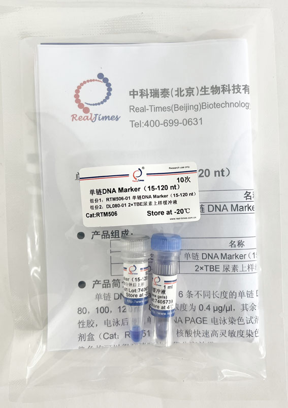 單鏈DNA Marker由6條不同長度的單鏈DNA分子混合而成,6條帶的大小為15,40,60,80,100,120 nt,80 nt 濃度為0.4 μg/μl,其余條帶濃度為0.2