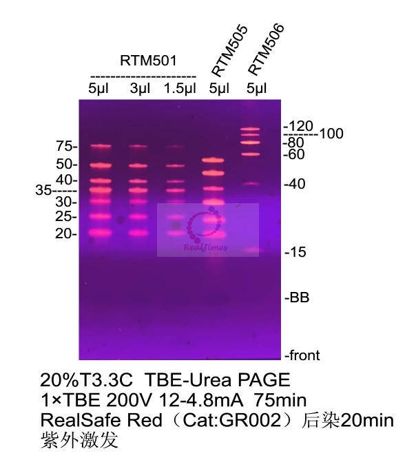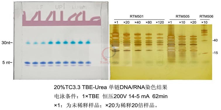 PAGE電泳染色試劑盒(Cat:RTS5103),核酸PAGE電泳染色試劑盒(Cat:RTS5102),核酸快速高靈敏度染色試劑盒(Cat:RTS5101)或RealSafe類核酸染料染色均可以得到清晰的條帶分離效果。