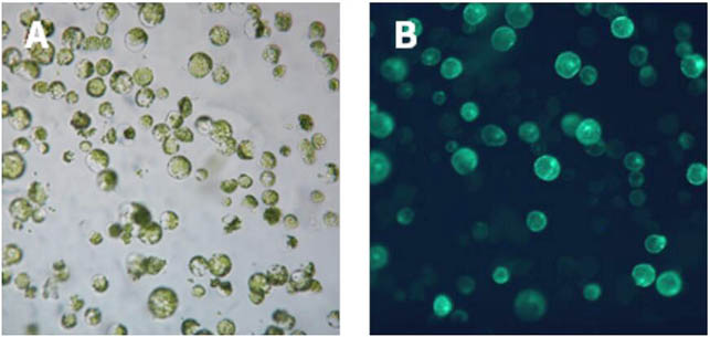 注:酶解時間與葉片種類,葉片生長狀態(tài)有關(guān),請根據(jù)實驗需要適當(dāng)調(diào)整酶解時間。3小時為擬南芥葉片推薦的酶解時間。如條件允許,可以使用微型真空泵常溫避光條件下抽真空30 min,以使酶溶液更好地進入細胞間隙。酶溶液變?yōu)榫G色表明有原生質(zhì)體已經(jīng)有分離,溶液為濃綠色表明原生質(zhì)體已經(jīng)大量分離。擬南芥原生質(zhì)體大小約為30-50 μm,顯微鏡鏡檢后確定是否分離。葉片原生質(zhì)體細胞顯微鏡下為綠色圓球狀,葉綠體分散在整個細胞內(nèi),說明狀態(tài)較好;如呈現(xiàn)不規(guī)則形狀,說明原生質(zhì)體破碎或即將破碎。