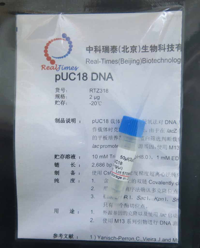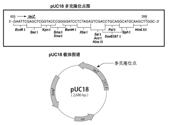 pUC18 載體適用于雙脫氧法對DNA 片段進(jìn)行測序,它克隆的 DNA 片段比使用 M13 phage作載體時克隆的片段長。 由于在 lacZ 領(lǐng)域中含有多克隆位點(diǎn), 因此可以在含有 IPTG、 X-Gal的平板培養(yǎng)基上通過藍(lán)白篩選判斷載體中有無 DNA 片段的插入。同時還可以通過載體上的lac promoter表達(dá)外源基因, 使用M13系列的通用引物對插入載體中的DNA片段進(jìn)行測序。