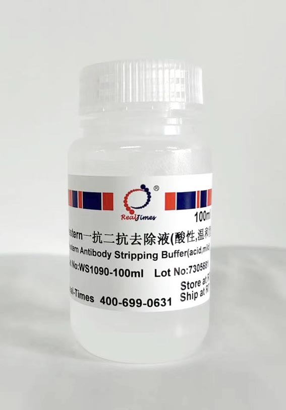 Western一抗二抗去除液(酸性,溫和型)(Western Antibody Stripping Buffer,acid,mild type)可以高效去除印跡膜上的一抗和二抗,而吸附在膜上的抗原基本不受影響,用于Western中轉移了蛋白膜的重復利用,可以轉一次膜,做多次Western印跡實驗,通常可以重復利用膜5-8次(PVDF膜)。使用本試劑只需大約20-30分鐘即可實現蛋白膜的重復使用,然后可以進行Western的后續操作。