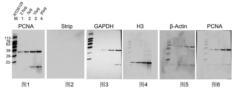 圖6:膜第4次清除后,PCNA檢測:PCNA鼠單抗 1:5000  RT  60 min孵育,羊抗鼠IgG-HRP 1:5000  RT 60min孵育,ECL曝光2秒。